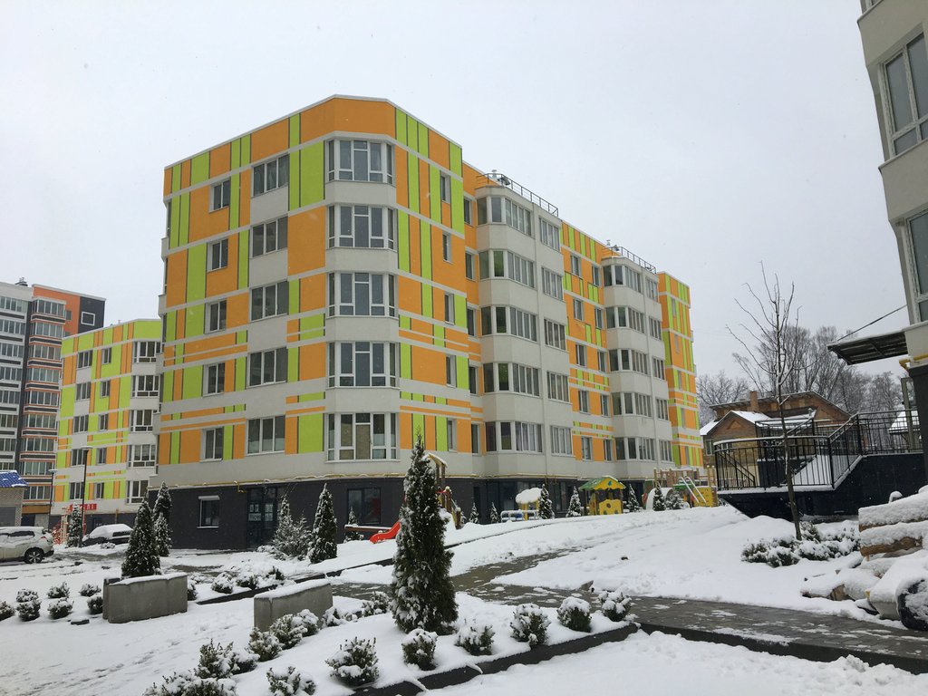 Несущие стены построены из высококачественного красного кирпича, фасад утеплен пенопластом 100 мм. Жилой комплекс выглядит незаурядным и привлекательным благодаря необычным формам и яркой расцветке.